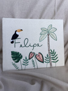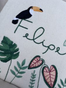 Envíame un mensaje por Whatsapp con el nombre del bebé/niño, los colores y el tema que te gustaría usar en el bordado. Basado en tus ideas, te enviaré un presupuesto con el valor del bordado para que lo evalúes.